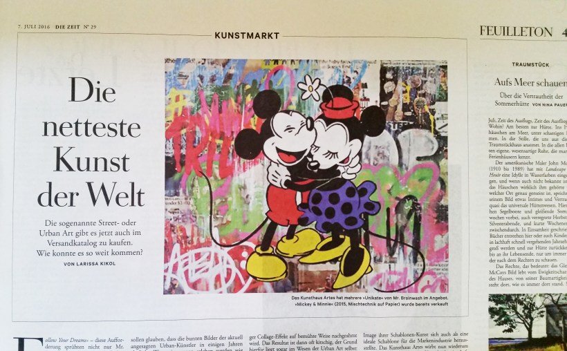 ARTIKEL DIE ZEIT/ Street – und Urban Art landen auf sauberen Leinwänden, in Galerien und in Versandkatalogen. Doch die Reproduktion des Straßenflairs zu transportablen, „coolen“ Deko-Objekten bringt vor allem Kitsch hervor. „FollowYour Dreams“ – diese Aufforderung sprühten nicht nur Mr. Brainwash und Banksy auf ihre Bilder, sie wird jetzt auch vom Kunsthaus Artes verbreitet. Unter dieser Überschrift erzählt das Versandhaus für Kunst in seinem Katalog das Erfolgsmärchen einer Subkultur nach und bewirbt mit gut zurechtgebogenen Verweisen auf die Kunstgeschichte seine Verkaufssparte Urban Art oder Street-Art.