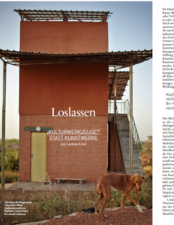 „Wie begreift man die vielen weiteren, politisch motivierten Aktionen, Projekte und Engagements, die aus Künstlerhand stammen oder die künstlerisch ästhetische Aspekte aufweisen? Sind die Handlungen des Zentrums für politische Schönheit als Kunstaktivismus oder als reine politische Meinungsmache zu deuten? Ist Christophs Schlingensiefs Operndorf ein Kunstwerk oder ein Hilfsprojekt? Gehören Kunsttherapien, wie beispielsweise von der japanischen Stiftung Today is the Day angeboten und von dem Künstler Noritoshi Hirakawa ins Leben gerufen, zur Kunstwelt dazu? Solche Fragen stellen sich immer wieder. Doch statt einer Einteilung in Kunst oder Nicht-Kunst, sollte man den Terminus ändern: Die Kategorie der ‚Kulturwerkzeuge‘ umfasst nicht nur all diese Projekte, sie eröffnet auch einen neuen konstruktiven Diskussionsraum über reale Folgen, Wirkungen, Nutzen und Fehler, fernab der abstrakten Werkbegriffsdebatten.“…