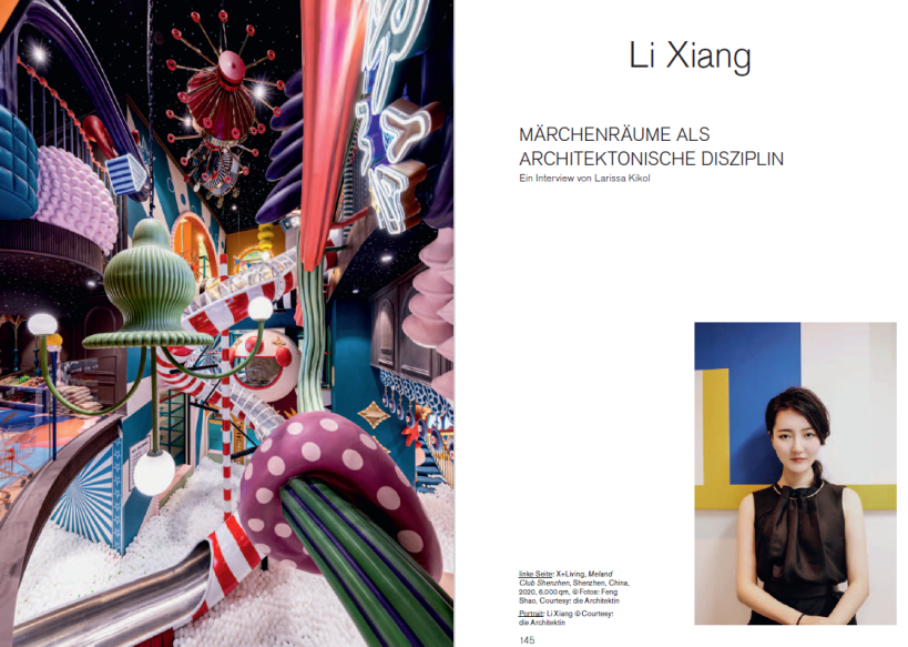Die Architektin Li Xiang gründete im Jahr 2011 X+Living Architectural Design in Shanghai, Mit ihrem Architektur- und Designteam will sie Kunst, Mode und Wirtschaft miteinander verbinden. Ein großer Fokus liegt auf der Innenarchitektur, auf diesem Feld entwirft sie vielfach preisgekrönte Projekte mit kommerziellen und ästhetischen Werten in Kultur, Einzelhandel, Hotellerie und anderen Branchen. Um die Integration von Möbeln in das Raumdesign zu erleichtern, gründete Li Xiang 2015 die Möbelmarke XiangCASA (2020 geändert in XIANG). Durch die weitere Nutzung des Einzelhandels will sie die künstlerischen Ideen von XIANG mit dem Alltagsleben verbinden, mit dem Ziel, die Kluft zwischen Kunst und Leben zu überbrücken. Ein besonderer Fokus von ihr sind Spieleparks für Familien. Diese wirken wie futuristische Luxusentwürfe oder eben wie Utopien von naiv, kindlichen Wunschträumen.