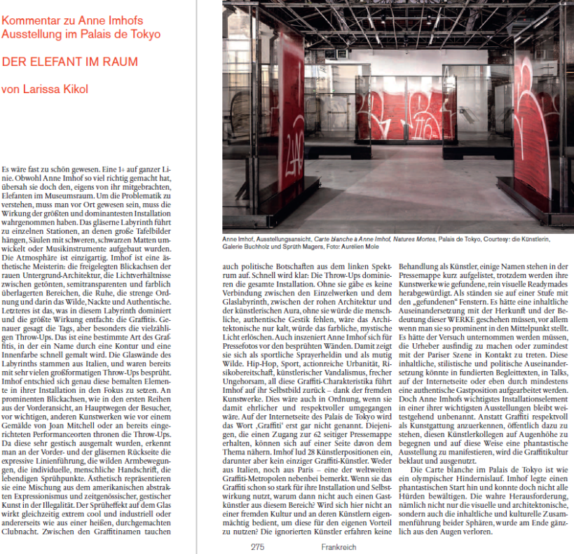 Es wäre fast zu schön gewesen. Eine 1+ auf ganzer Linie. Obwohl Anne Imhof so viel richtig gemacht hat, übersah sie doch den, eigens von ihr mitgebrachten, Elefanten im Museumsraum. Um die Problematik zu verstehen, muss man vor Ort gewesen sein, muss die Wirkung der größten und dominantesten Installation wahrgenommen haben. Das gläserne Labyrinth führt zu einzelnen Stationen, an denen große Tafelbilder hängen, Säulen mit schweren, schwarzen Matten umwickelt oder Musikinstrumente aufgebaut wurden. Die Atmosphäre ist einzigartig. Imhof ist eine ästhetische Meisterin: die freigelegten Blickachsen der rauen Untergrund-Architektur, die Lichtverhältnisse zwischen getönten, semitransparenten und farblich überlagerten Bereichen, die Ruhe, die strenge Ordnung und darin das Wilde, Nackte und Authentische. Letzteres ist das, was in diesem Labyrinth dominiert und die größte Wirkung entfacht: die Graffitis. Genauer gesagt die Tags, aber besonders die vielzähligen Throw-Ups. Das ist eine bestimmte Art des Graffitis, in der ein Name durch eine Kontur und eine Innenfarbe schnell gemalt wird. Die Glaswände des Labyrinths stammen aus Italien, und waren bereits mit sehr vielen großformatigen Throw-Ups besprüht. Imhof entschied sich genau diese bemalten Elemente in ihrer Installation in den Fokus zu setzen. An prominenten Blickachsen, wie in den ersten Reihen aus der Vorderansicht, an Hauptwegen der Besucher, vor wichtigen, anderen Kunstwerken wie vor einem Gemälde von Joan Mitchell oder an bereits eingerichteten Performanceorten thronen die Throw-Ups. Da diese sehr gestisch ausgemalt wurden, erkennt man an der Vorder- und der gläsernen Rückseite die expressive Linienführung, die wilden Armbewegungen, die individuelle, menschliche Handschrift, die lebendigen Sprühpunkte. Ästhetisch repräsentieren sie eine Mischung aus dem amerikanischen abstrakten Expressionismus und zeitgenössischer, gestischer Kunst in der Illegalität. Der Sprüheffekt auf dem Glas wirkt gleichzeitig extrem cool und industriell oder andererseits wie aus einer heißen, durchgemachten Clubnacht. Zwischen den Graffitinamen tauchen auch politische Botschaften aus dem linken Spektrum auf. Schnell wird klar: Die Throw-Ups dominieren die gesamte Installation. Ohne sie gäbe es keine Verbindung zwischen den Einzelwerken und dem Glaslabyrinth, zwischen der rohen Architektur und der künstlerischen Aura, ohne sie würde die menschliche, authentische Gestik fehlen, wäre das Architektonische nur kalt, würde das farbliche, mystische Licht erlöschen. Auch inszeniert Anne Imhof sich für Pressefotos vor den besprühten Wänden. Damit zeigt sie sich als sportliche Sprayerheldin und als mutig Wilde. Hip-Hop, Sport, actionreiche Urbanität, Risikobereitschaft, künstlerischer Vandalismus, frecher Ungehorsam, all diese Graffiti-Charakteristika führt Imhof auf ihr Selbstbild zurück – dank der fremden Kunstwerke. Dies wäre auch in Ordnung, wenn sie damit ehrlicher und respektvoller umgegangen wäre. Auf der Internetseite des Palais de Tokyo wird das Wort ‚Graffiti‘ erst gar nicht genannt. Diejenigen, die einen Zugang zur 62 seitiger Pressemappe erhalten, können sich auf einer Seite davon dem Thema nähern. Imhof lud 28 Künstlerpositionen ein, darunter aber kein einziger Graffiti-Künstler. Weder aus Italien, noch aus Paris – eine der weltweiten Graffiti-Metropolen nebenbei bemerkt. Wenn sie das Graffiti schon so stark für ihre Installation und Selbstwirkung nutzt, warum dann nicht auch einen Gastkünstler aus diesem Bereich? Wird sich hier nicht an einer fremden Kultur und an deren Künstlern eigenmächtig bedient, um diese für den eigenen Vorteil zu nutzen? Die ignorierten Künstler erfahren keine Behandlung als Künstler, einige Namen stehen in der Pressemappe kurz aufgelistet, trotzdem werden ihre Kunstwerke wie gefundene, rein visuelle Readymades herabgewürdigt. Als ständen sie auf einer Stufe mit den „gefundenen“ Fenstern. Es hätte eine inhaltliche Auseinandersetzung mit der Herkunft und der Bedeutung dieser WERKE geschehen müssen, vor allem wenn man sie so prominent in den Mittelpunkt stellt. Es hätte der Versuch unternommen werden müssen, die Urheber ausfindig zu machen oder zumindest mit der Pariser Szene in Kontakt zu treten. Diese inhaltliche, stilistische und politische Auseinandersetzung könnte in fundierten Begleittexten, in Talks, auf der Internetseite oder eben durch mindestens eine authentische Gastposition aufgearbeitet werden. Doch Anne Imhofs wichtigstes Installationselement in einer ihrer wichtigsten Ausstellungen bleibt weitestgehend unbenannt. Anstatt Graffiti respektvoll als Kunstgattung anzuerkennen, öffentlich dazu zu stehen, diesen Künstlerkollegen auf Augenhöhe zu begegnen und auf diese Weise eine phantastische Ausstellung zu manifestieren, wird die Graffitikultur beklaut und ausgenutzt.
