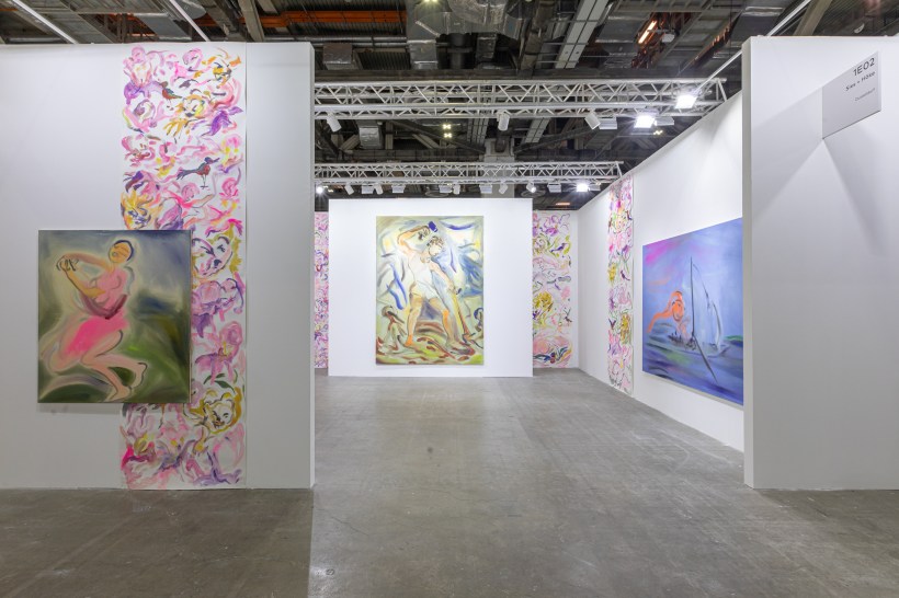 Sophie von Hellermann zeigt eine leichte, wässrige Malerei. Der Fluss aus Farben und Verläufen schwemmen Meere und Boote an. Spielerisch schwebend wirken auch die Tapetenbahnen, die Strudel aus Blumen, Vögel und Figuren. Hellermanns Welt scheint auf den ersten Blick sachte zu schwingen, ein bisschen feminin, ein bisschen verliebt. Wie durch eine rosa rote Brille gemalt. Doch das ist nur die erste Ebene, der erste Lockruf. Dahinter stehen ernstere Geschichten, die in unserer Zeit ihre Reflektion finden.