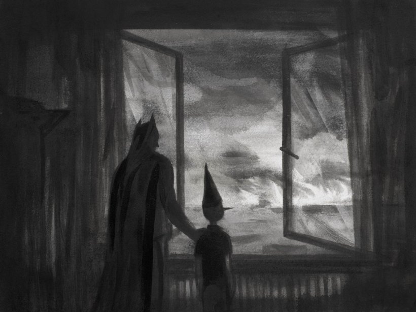 Doch beim näheren Hinsehen erkennt man, dass es sich nicht um ein Bett, sondern um ein Sofa handelt. Also ein Ausweichquartier, vielleicht bei Freunden zu Besuch, oder im eigenen Zuhause nach einem Streit im Schlafzimmer. Die Figur befindet sich demnach an einem Zwischenort, der birgt zwar einen gewissen Komfort, Decken sind ebenfalls vorhanden, aber trotzdem bleibt er eine entrückte Zwischenstätte, wie ein Flughafen, der weder Heimat noch Ankunftsort ist. Das Zimmer wirkt leicht surreal, lässt einen Dschungel erträumen, Pflanzen, die zusätzlich vom Licht abschirmen und für ein aufregendes, der Welt entrücktes, Schattenspiel sorgen. In der Nacht wandelt sich der Raum, die Zeit und der Ort. Dinge mit klaren Konnotationen verlieren ihren Zweck und werden Kulisse in einer Märchenwelt, die je nach psychologischer Stimmung der Figur mehr oder weniger bedrohlich erscheint, mal als unschuldige Kindheitserinnerung oder mal als mystischer Weltschmerz.