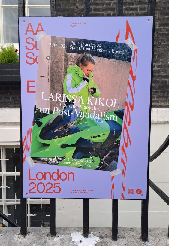 Ich habe mich sehr gefreut an der renommierten Architekturhochschule Architectural Association School of Architecture in London über meine Forschung zu Post-Vandalismus sprechen zu dürfen. Hierzu habe ich auch meinen Themenband „Post-Vandalismus“, erschienen bei Kunstforum International, vorgestellt. Der Vortrag fand im Rahmen der Summer School „Punk Spaces“ von Jacob Höppner und Leo Herrmann statt.