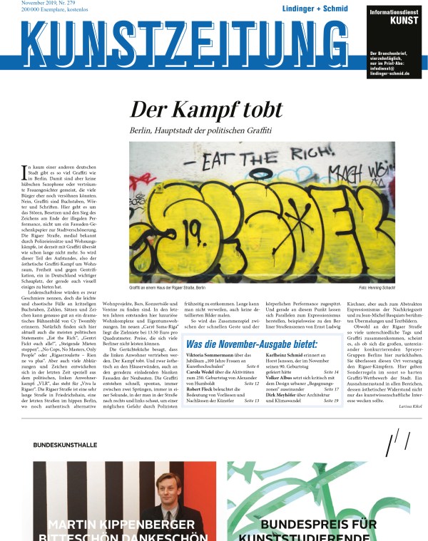 Titelstory Kunstzeitung // Politische Graffitis in der Rigaer Straße Berlin gegen Mieterhöhungen und Gentrifizierung. Oder: Ein Stadtbühnenbild von Cy Twombly.