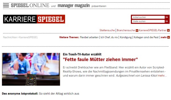 anonymes Jobprotokoll – Spiegel Karriere// Ich unterhielt mich mit einem Autoren des Scripted-Reality-TVs und schrieb für ihn seine Erfahrungen auf. Die ‚Dramaturgie des Anschreiens‘