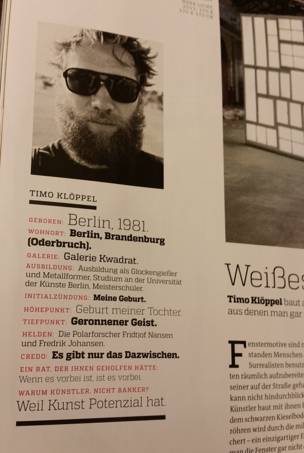 Art Magazin// Text für Starter Timo Klöppel „[…] Die auf der Straße gefundenen Berliner-Altbaufenster öffnen keinen Durchgang, sondern schirmen ab,