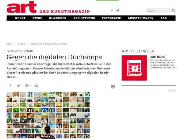 Gegen die digitalen Duchamps art das Kunstmagazin Online / Immer mehr Künstler übertragen die Bildästhetik sozialer Netzwerke in den Ausstellungsraum.