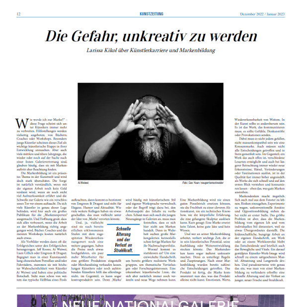 Wie werde ich zur Marke?“ –diese Frage scheint sich unterKünstlern immer mehrzu verbreiten. Hilfestellungen werdenvielseitig angeboten; von Büchern,Coaches oder Workshops.
