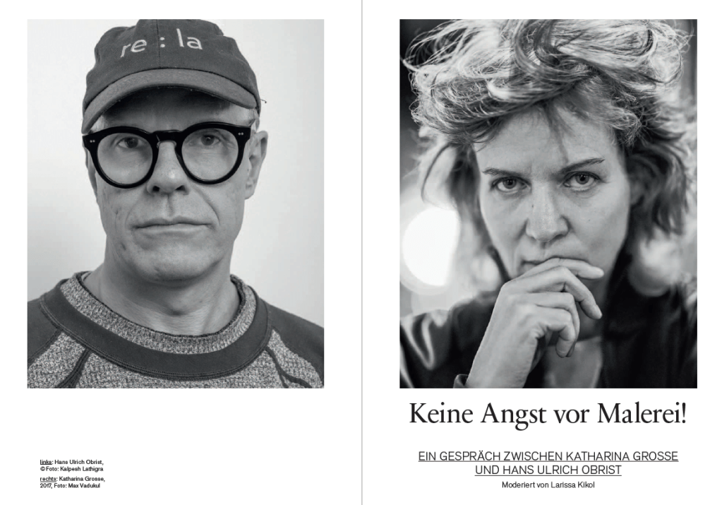 „Keine Angst vor Malerei! Ein Gespräch zwischen Katharina Grosse und Hans Ulrich Obrist, moderiert von Larissa Kikol“ in: Gegenwartsbefreiung Malerei – Tendenzen im 21. Jahrhundert, Kunstforum International, Band 268, 2020