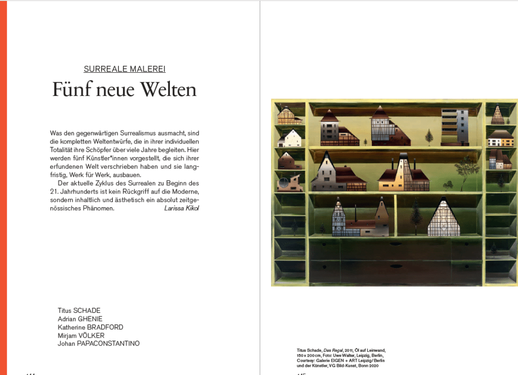 „Fünf neue Welten – Titus Schade, Adrian Ghenie, Katherine Bradford, Mirjam Völker, Johan Papaconstantino“, in: Gegenwartsbefreiung Malerei – Tendenzen im 21. Jahrhundert, Kunstforum International, Band 268, 2020