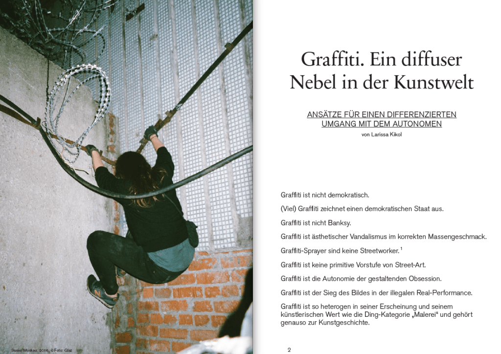 „Graffiti. Ein diffuser Nebel in der Kunstwelt. Ansätze für einen differenzierten Umgang mit dem Autonomen“ in: Kunstforum International, Graffiti Now, Band 260, 2019