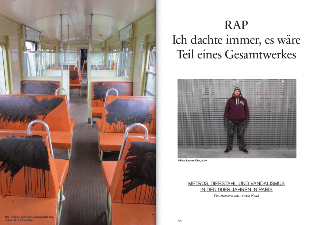 „Ich dachte immer es wäre Teil eines Gesamtwerkes – Metros, Diebstahl und Vandalismus in den 90er Jahren in Paris“ Interview mit RAP, in: Kunstforum International, Graffiti Now, Band 260, 2019