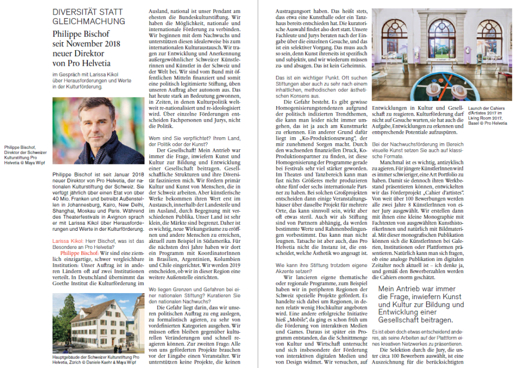 „Diversität statt Gleichmachung“ Gespräch mit Philippe Bischof (Pro Helvetia) in: Kunstforum International, Band 257, 2018