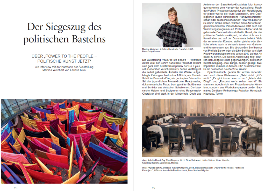 „Der Siegeszug des politischen Bastelns – Über Power to the People – Politische Kunst Jetzt“ + Interview mit Martina Weinhart, Kunstforum International, Band 254: „Politik, Ethik, Kunst“, 2018