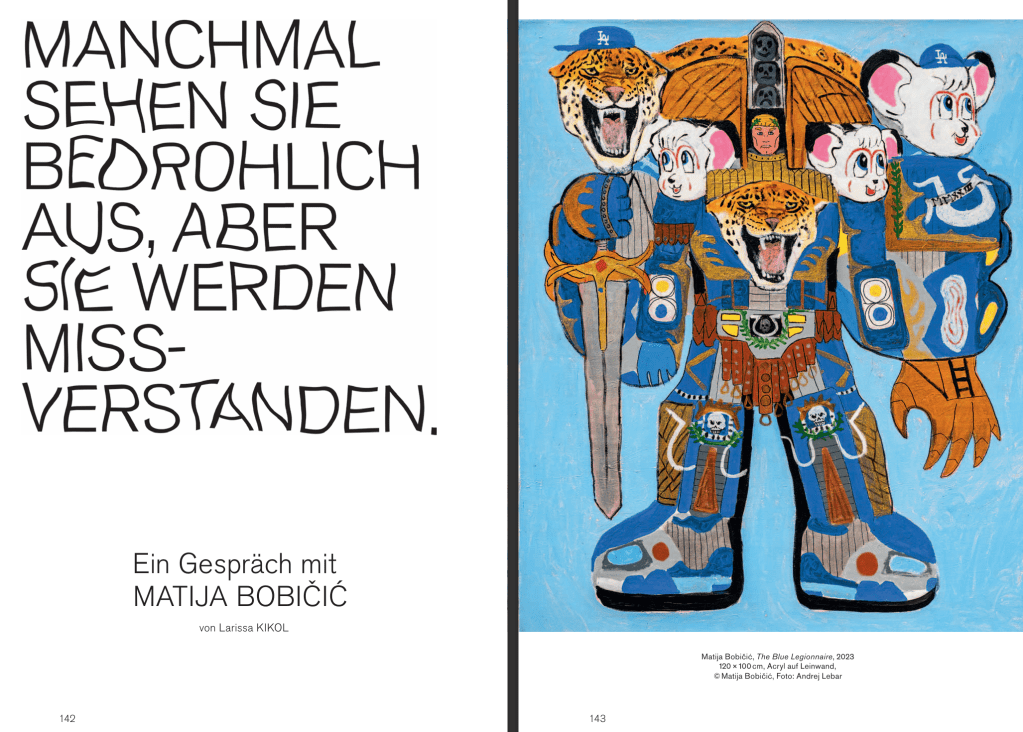 Gespräche mit: Katharina Grosse und Hans Ulrich Obrist, Bonaventure Soh Bejeng Ndikung, Andreas Breunig, Veli und Amos, Robin F. Williams. Gastautoren: Ulrich Loock, Oliver Zybok, Anika Meier und Anneli Botz