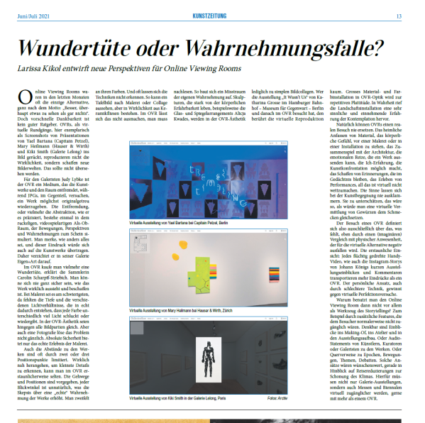 Kunstzeitung // Artikel zum ganzen Text hier: http://lindinger-schmid.de/wp-content/uploads/2021/07/KUNSTZEITUNG-2021_06_07.pdf Einleitung: „Online Viewing Rooms waren in den letzten Monatenoft die einzige Alternative,ganz